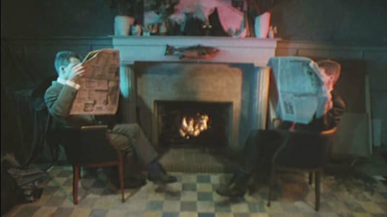 Two men in chairs by the open hearth; photos move in front of their heads.