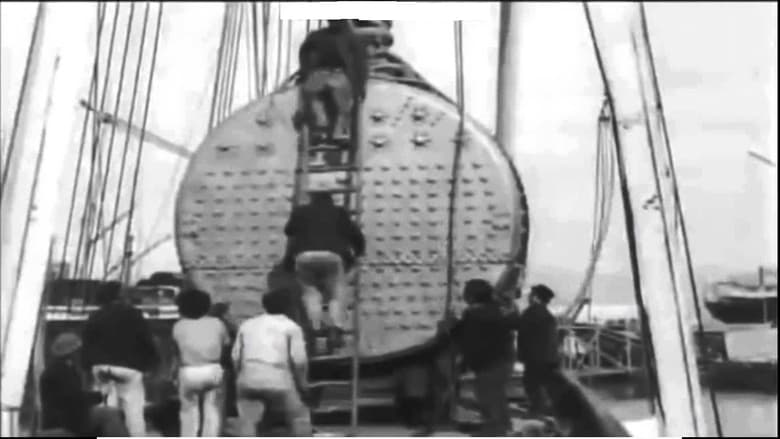 A stationary camera placed amidships looks toward the round end of a 10- or 12-foot boiler that's been loaded onto the open deck. Three men climb down from atop the boiler and then remove their ladder. Four or five other workers tie the boiler down to the deck. Their pace is leisurely. In the background is a busy harbor.